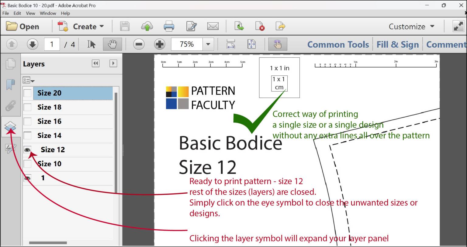 For your convenience, all our PDF patterns are clearly labeled. The majority of our patterns are provided as individual PDF files, while some patterns may be included in an all-in-one PDF file with separate layers. Let’s explore how the PDF layer panel functions: