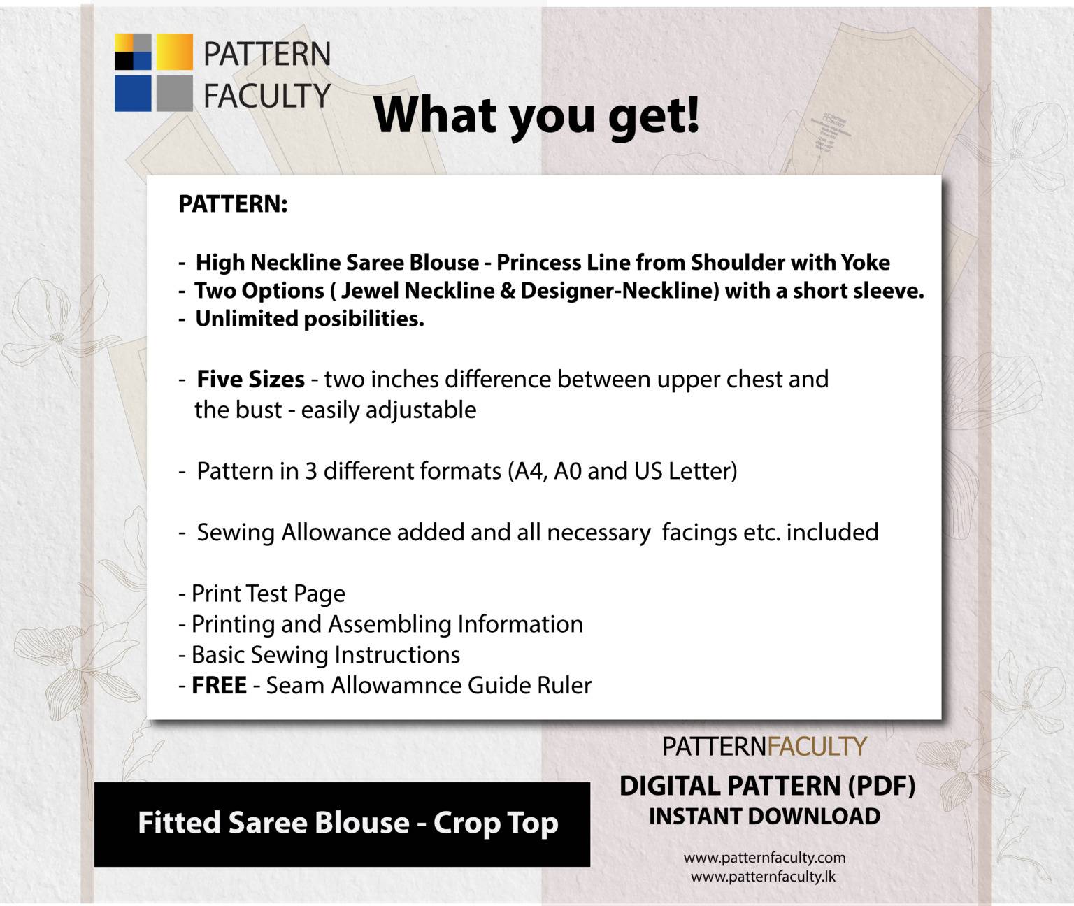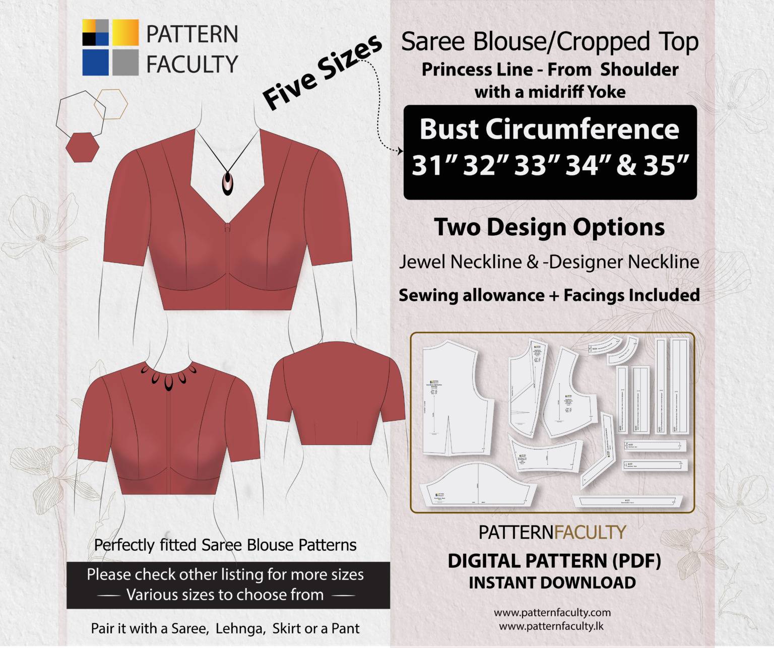 Elevate your fashion with our PDF Digital Pattern for a Saree Blouse featuring a stylish High neckline and an elegant Princess Line cut that flows from the mid-shoulder to the under bust and finishing with a beautiful midriff yoke. This pattern is designed to fit a range of sizes, accommodating bust circumferences 31, 32, 33, 34 & 35 inches. You can customize the blouse with a classic Jewel Neckline, a modern designer Neckline or give your own neckline design. The blouse harmoniously complements sarees, lehngas, skirts, or pants, enabling you to effortlessly fashion high-necked blouses that infuse a hint of sophistication into any attire. Feel free to embellish your saree blouse with piping, sequins, or any other decorative elements to elevate its beauty even further.