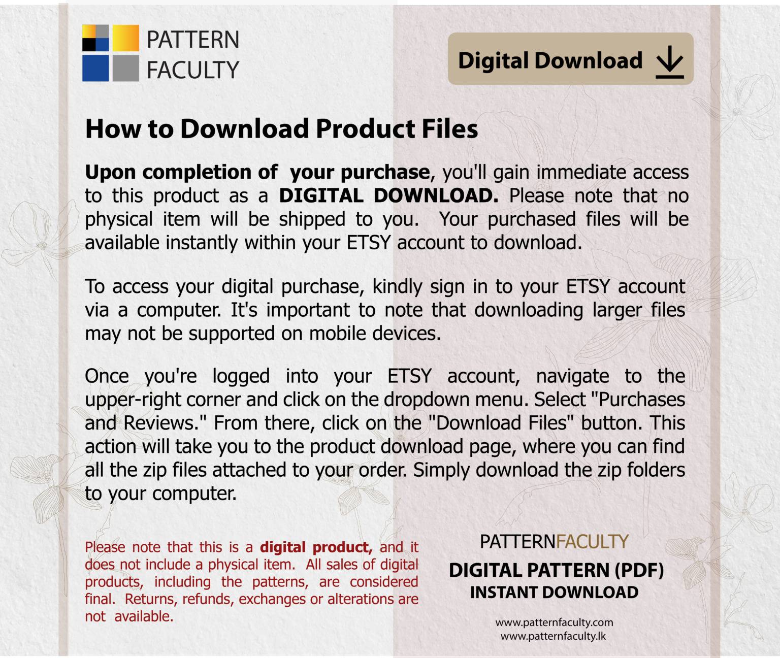 Instant Downloads: Once your payment is confirmed, you will have access to download the pattern files. Kindly ensure that you check both your Pattern Faculty account and the email address associated with it for the download links.