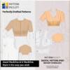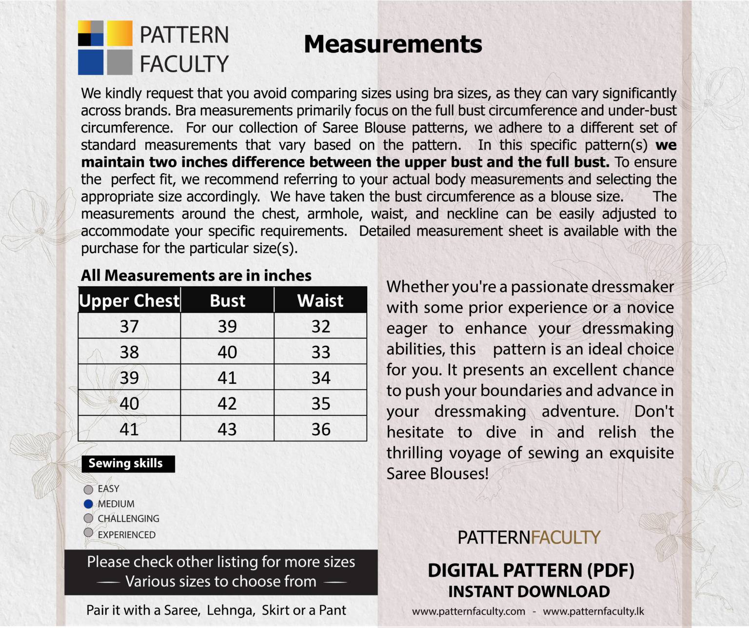IMPORTANT – MEASUREMENTS: This pattern set is drafted with a two-inch difference between the upper bust and bust circumference. Before making a purchase, we kindly request you to ensure accurate measurements. Please measure your chest circumference, full bust circumference, and the waist circumference. Once you have taken these measurements, compare them with the measurement chart provided below. If your body measurements do not align with any of these sizes mentioned below, kindly consider checking out alternative size group options available here. We have sizes from Bust circumference 31” to 55” available in this range.