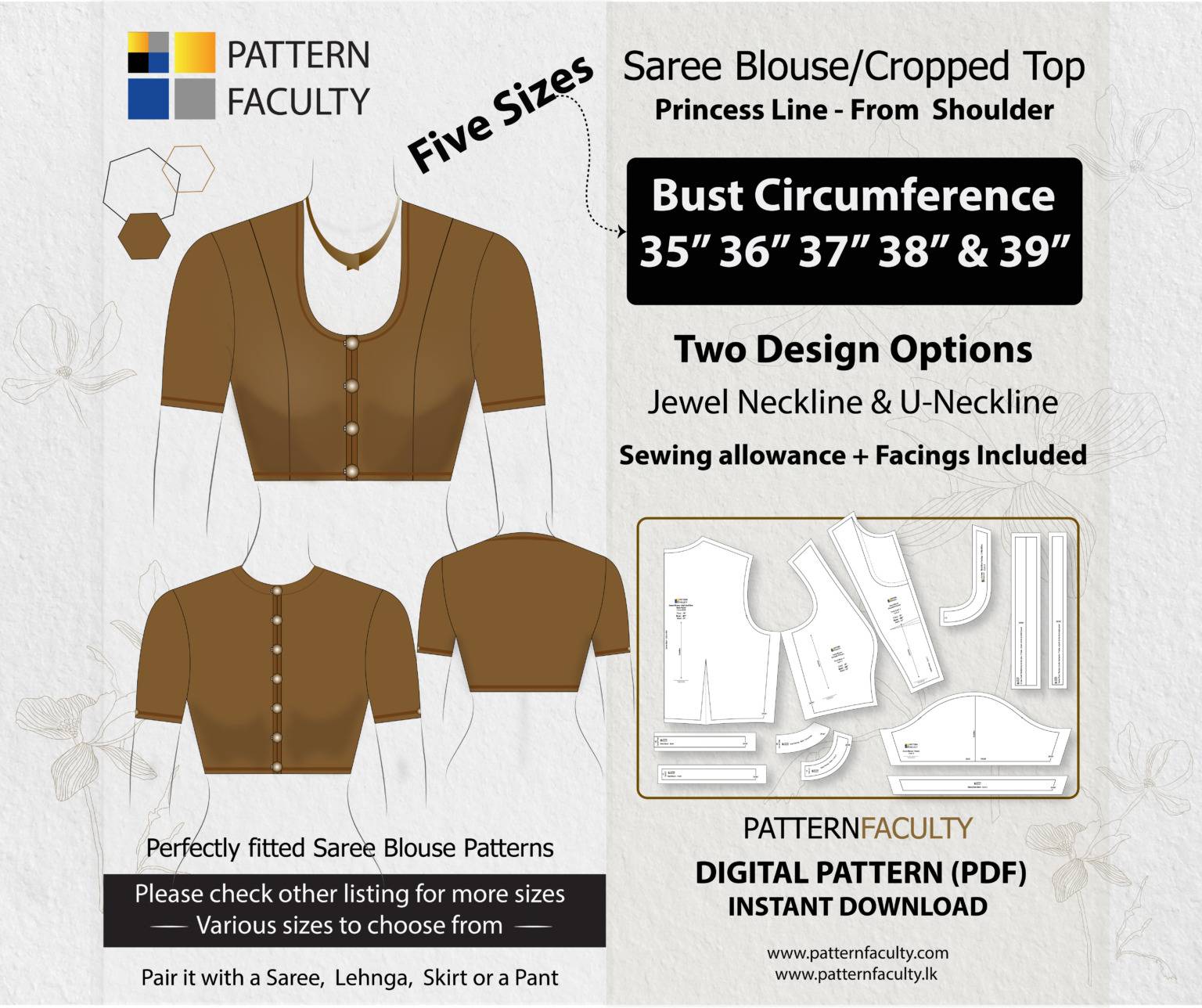 Saree Blouse High Neckline Digital Pattern – Princess Line from Shoulder – One Design with two options (Jewel Neckline and U-neckline) – Sizes Bust circumference 35, 36, 37, 38 and 39 PDF Digital Pattern for a High-Neck Saree Blouse (Crop Top/Fitted Top) – Your Gateway to Elegant Style.