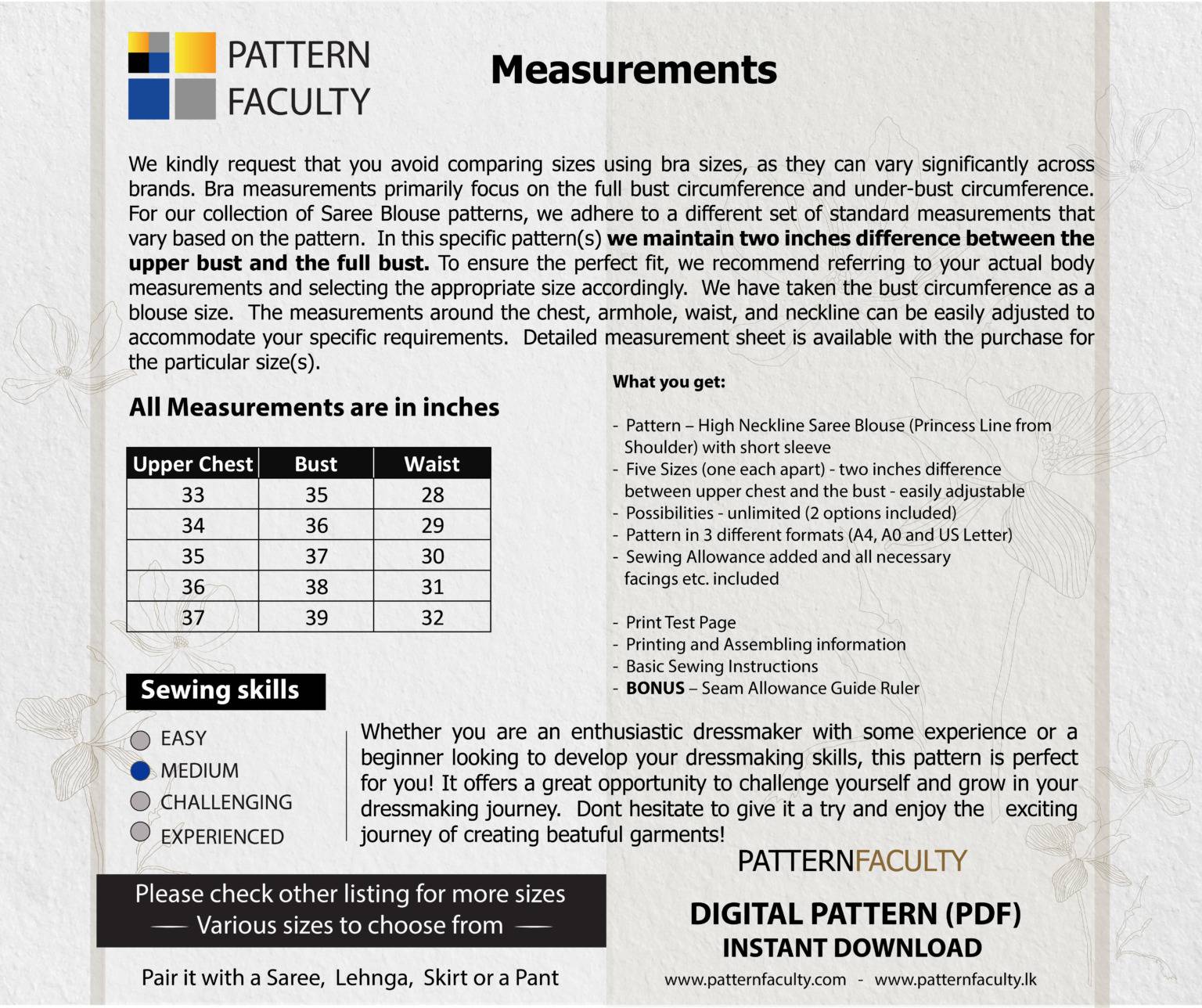 IMPORTANT – MEASUREMENTS: This pattern set is drafted with a two-inch difference between the upper bust and bust circumference. Before making a purchase, we kindly request you to ensure accurate measurements. Please measure your chest circumference, full bust circumference, and the waist circumference. Once you have taken these measurements, compare them with the measurement chart provided below. If your body measurements do not align with any of these sizes mentioned below, kindly consider checking out alternative size group options available here. We have sizes from Bust circumference 31” to 55” available in this range.