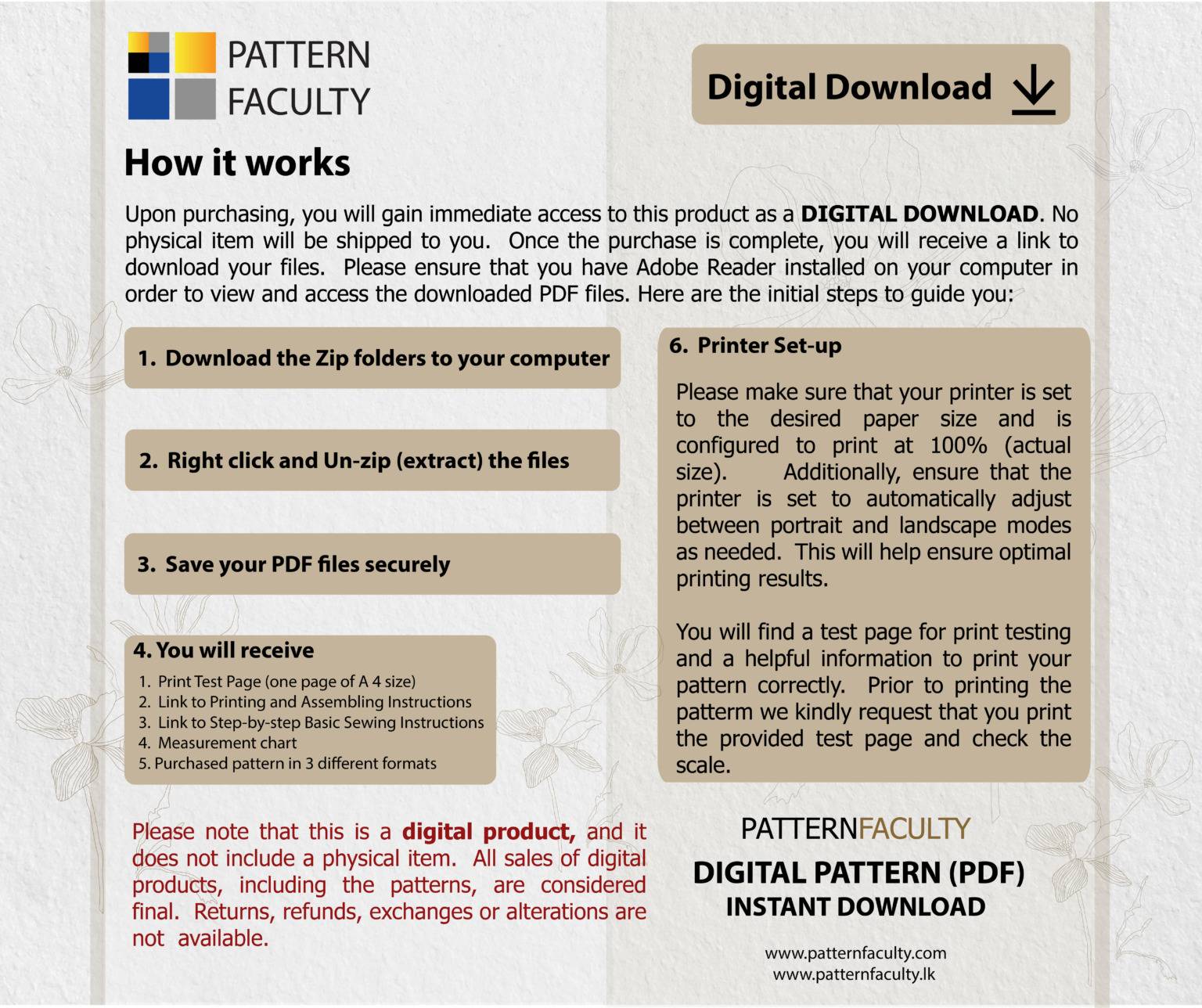 Printing: You have two options for printing your downloaded pattern. The first option is to print it using your home printer. Alternatively, you can choose to have it printed at a local printing shop. Please note that in order to view these files, you will need to have Adobe Reader installed on your computer. These files are compressed in a zip format, and you’ll need to extract them to access your PDF documents. Once you purchase the pattern, you will be provided with detailed instructions on how to set up your printer, assemble the A4 size or US letter size pattern papers, and also basic sewing instructions.