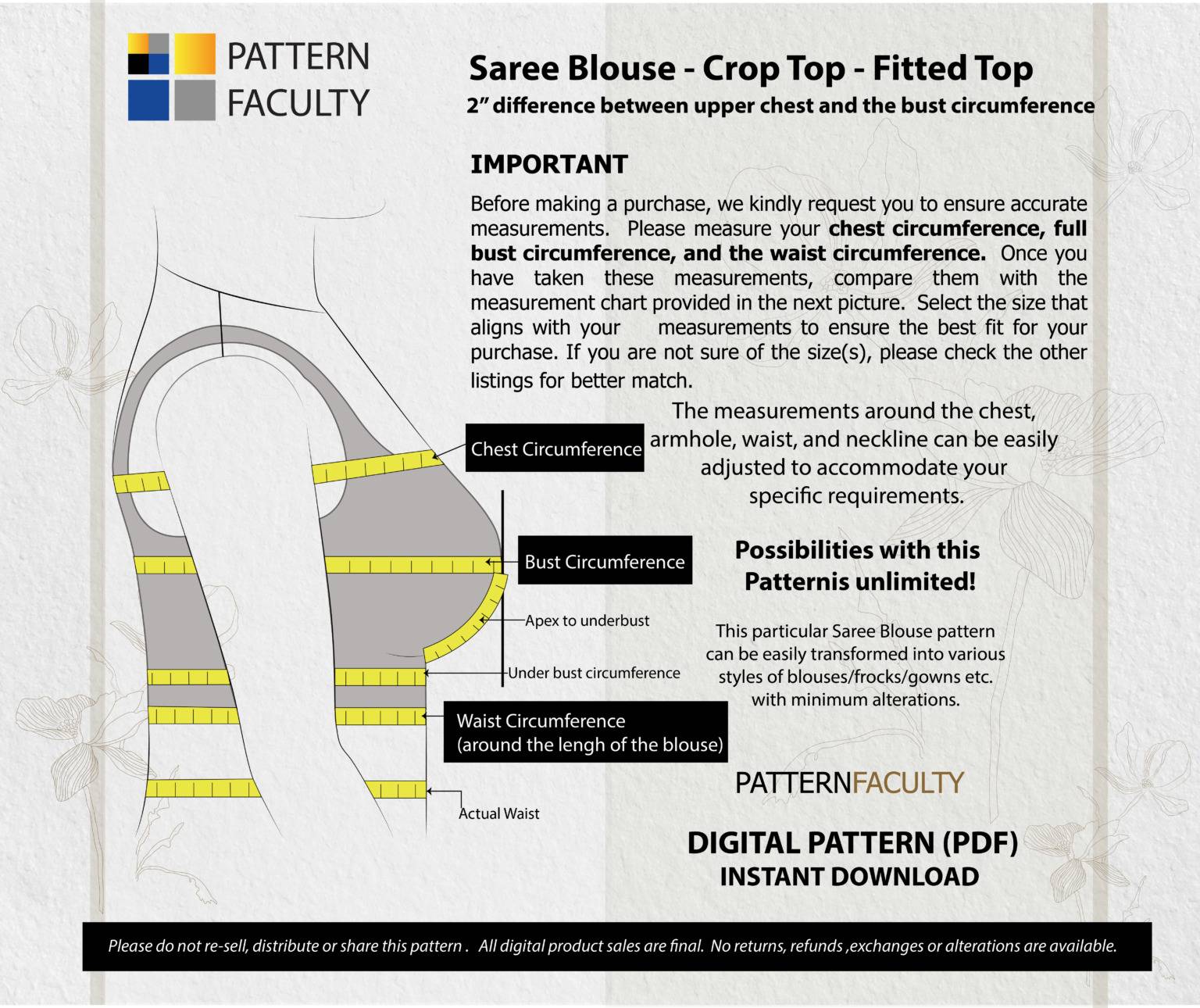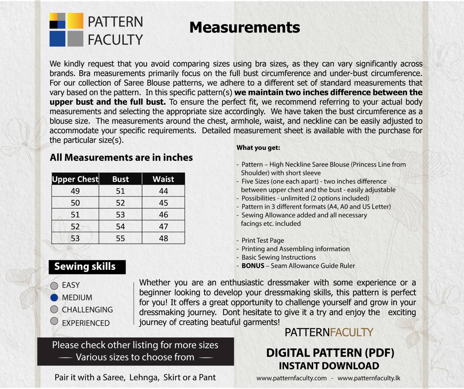 IMPORTANT – MEASUREMENTS: This pattern set is drafted with a two-inch difference between the upper bust and bust circumference. Before making a purchase, we kindly request you to ensure accurate measurements. Please measure your chest circumference, full bust circumference, and the waist circumference. Once you have taken these measurements, compare them with the measurement chart provided below. If your body measurements do not align with any of these sizes mentioned below, kindly consider checking out alternative size group options available here. We have sizes from Bust circumference 31” to 55” available in this range.