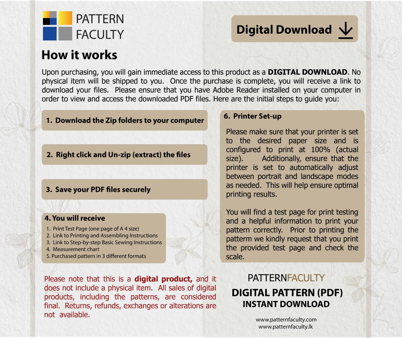 Instant Downloads: Once your payment is confirmed, you will have access to download the pattern files. Kindly ensure that you check both your Pattern Faculty account and the email address associated with it for the download links.