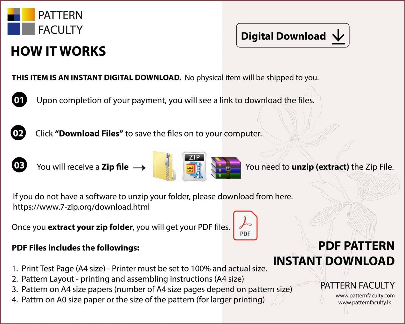 Instant Downloads: Once your payment is confirmed, you will have access to download the pattern files. Kindly ensure that you check both your Pattern Faculty account and the email address associated with it for the download links.